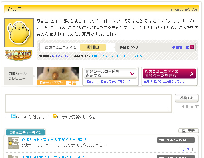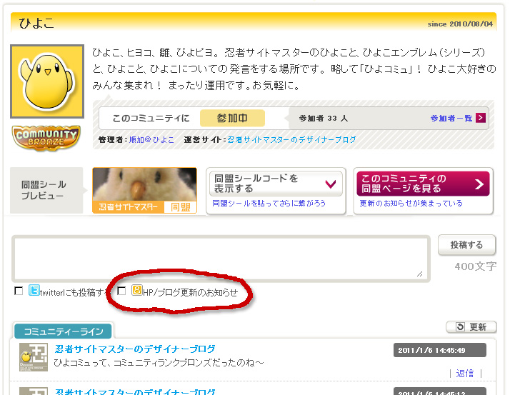 このページには、コミュニティーで発言した内容のうち、「HP/ブログ更新のお知らせ」っていうチェックをオンにした発言だけが集まっているんですね。