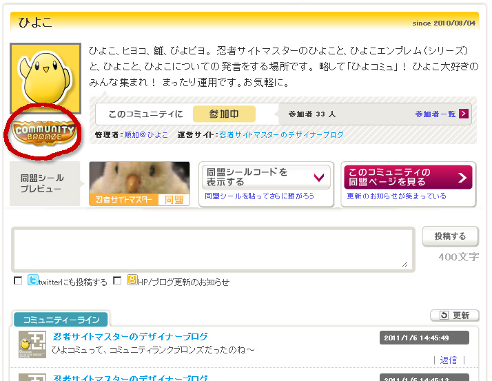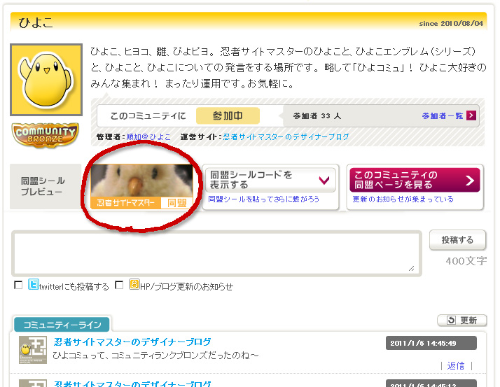 同盟シールは誰でも貼り付け可能(コミュニティーに入っていない人でも)。この右のボタンを押すと、貼りつけソースコードが表示されますよ。
